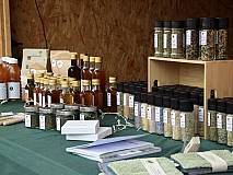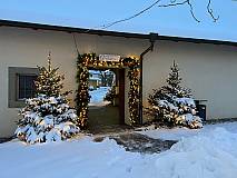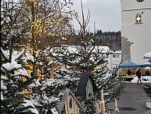 Kaum in Frienisberg angekommen, leiten mich die parkierten Autos zum Markt. Ich könnte auch einfach dem Duft folgen, dann würde ich den Markt problemlos finden. Sofort fallen mir die Buchskugeln und der BernARTiner auf, die festlich die Weihnachtsmütze aufgesetzt haben. "Üse Wiehnachtsmärit" steht an der Strasse, wo ich mit einem zauberhaft geschmückten Eingang herzlich empfangen werde.